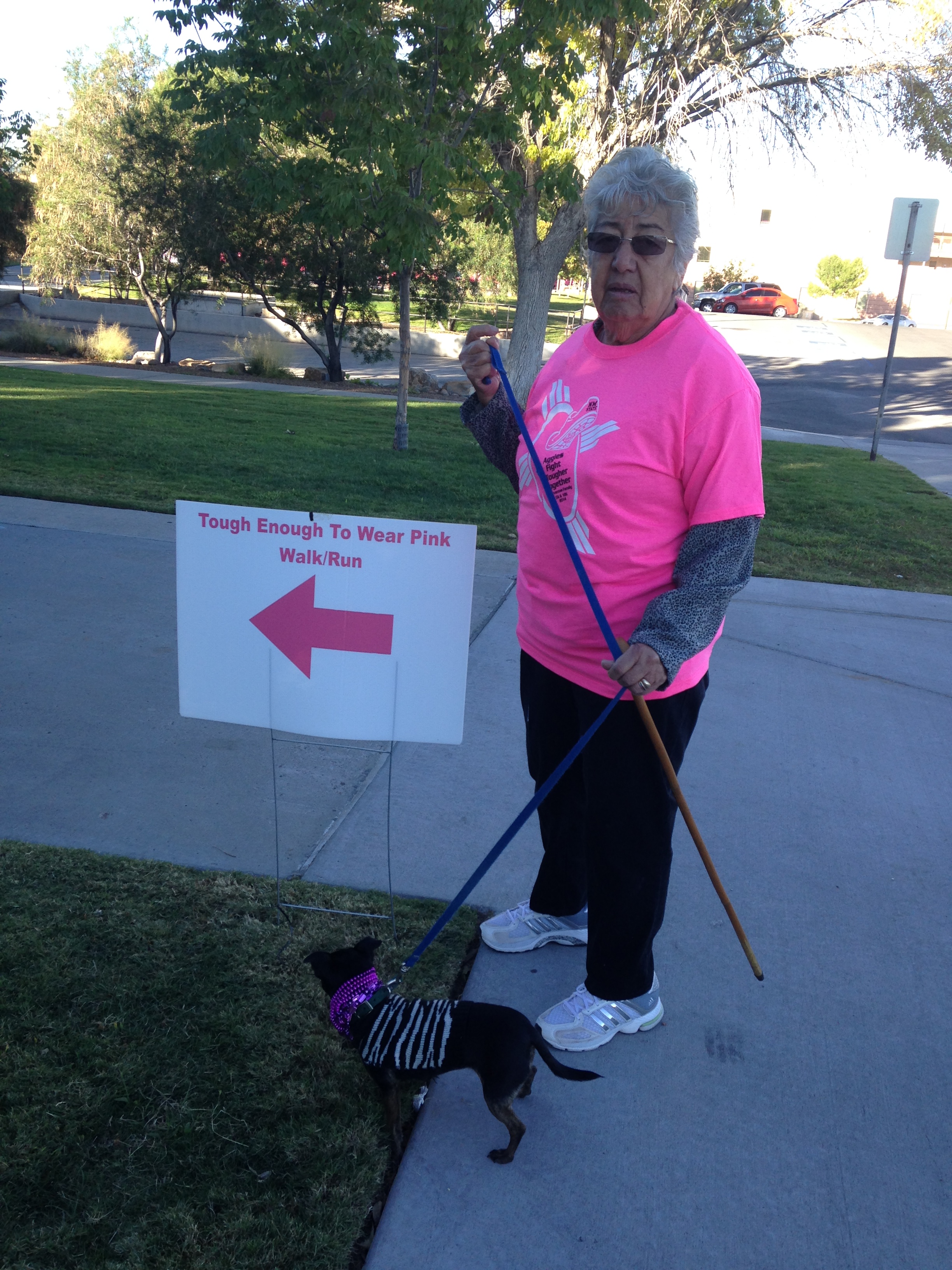 Joy is what you experience when life transcends expectations in a way you could never imagine. I experienced joy a few days ago as I planned to join the Proud Enough to Wear Pink Cancer Walk/Run on Saturday, October 4. My 81-year old mom arrived at my house the night before so I decided to take her and her little Chihuahua named Bella with me to the cancer walk. I was going to meet some friends and walk (or run) the 5k, hoping to run a little as well. I put pink beads on the charcoal-colored Bella to fit her to the occasion. I gave my mom a pink shirt to wear. I had hoped that my mom would just treasure the fresh air and the pink clouds of people walking and jogging away from her. My thought was to have her walk to a bench. I would leave her to people-watch, and then in a blink of an eye my plan was to return to her after having run the 5k. We started with the walkers around 8:30 am. As we proceeded downhill, she and I were talking about the various buildings along the way. “There is a new dorm,” I said. “I used to be in this dorm during summer school.” She never got a chance to visit me when I was in college. “That is the building that I work in now,” all the time pointing in one direction or another. She observed that the campus was very attractive as we continued our walk. She commented on the pond and the mature trees and flowers. Bella would interrupt us regularly as a leashed dog would pass by. When the leashed dog were approximately fifty feet away, Bella would begin to act tough and start yelping frantically. One time, a German Shepherd unexpectedly passed right by her side. You could tell its mere size frightened her as she cowered in his presence and quickly ran between me and my mom. The German Shepherd went further ahead, and sure enough Bella would bark after it like an angry tiger. It was quite comical.